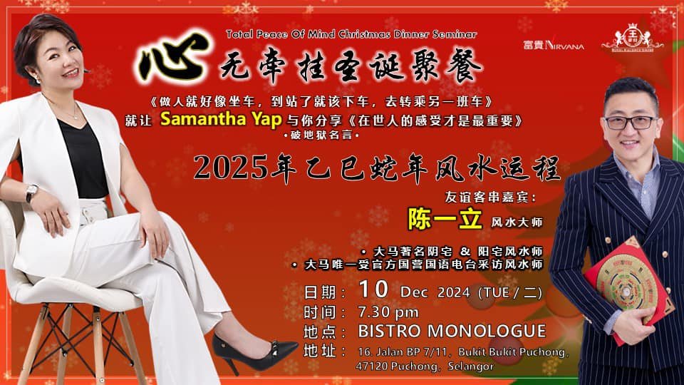 10/12/2024年二十四年终,我们将举办今年最后一场“心无牵挂”聚餐活动,大家一起合心聚气,享受活动的典为而欣赏。此次聚餐将特别邀请知名风水大师“陈一立”作为特邀主计,他将实地为大家分享“2025年乙巳年蛇年的风水运算和未来运势”,清楚解析天方地道在新年如何意味着最大的动力和模式。